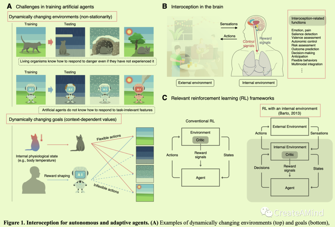 在这里,我们提出了一个新的框架,称为内感受性人工智能,赋予人工智能一个内部环境和内感受性输入,这提供了一个关键的功能,它保证了自主性和适应性。这个框架旨在建立一个可以维持内部(环境)状态的稳态(词汇表中的粗体字)的代理,以便生存,这需要监控其内部状态(即内部感受)的能力。在开发这个框架的过程中,我们采用了控制论中的原始概念,并将其与最近关于自组织的理论工作(如主动推理)相结合,以形式化人工智能体的内部状态[9,10]。我们认为这一框架有潜力解决强化学习(RL)研究中的紧迫问题,如内在奖励和非稳定环境,并提供计算工具来模拟内部感受和影响[11,12]以及情绪-认知交互[13,14]。