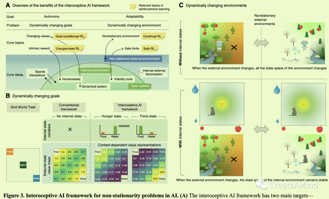 内感受性人工智能框架有可能给人工智能和神经科学研究带来好处。在本节中,我们首先讨论这个框架如何解决非平稳性问题[7],非平稳性问题通常指非平稳目标(即奖励函数的变化)或非平稳外部环境(即状态转移概率的变化)(图3A)。这些挑战长期以来一直是RL领域的中心话题,因为非平稳性违反了传统方法的共同假设——回报函数和状态转移概率不随时间变化[66]。内感受性人工智能框架从活生物体中获得灵感来解决这些问题,认识到所有幸存的生物体都已经发展出适应非平稳环境的方法。