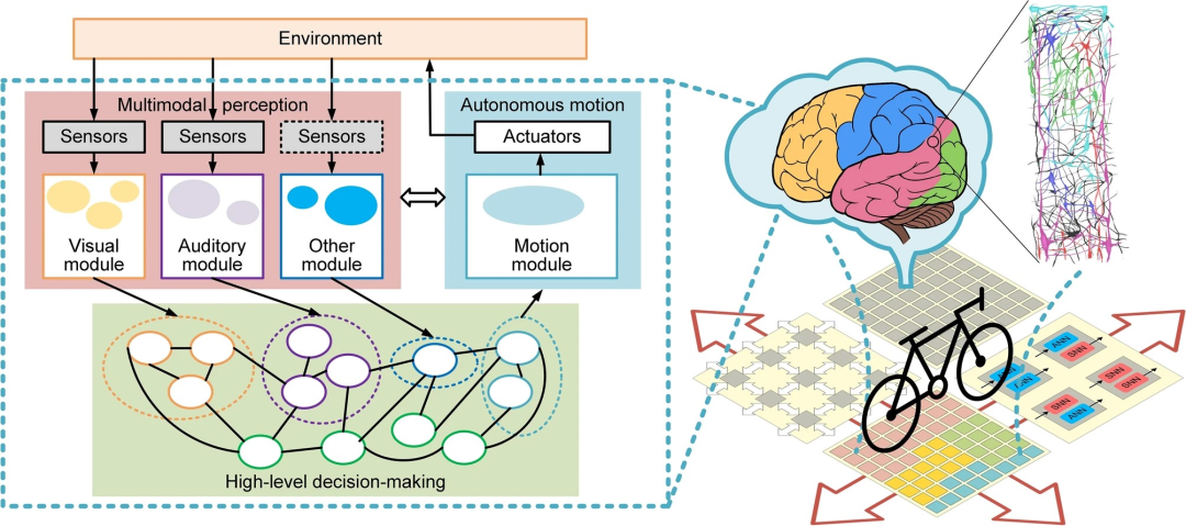 为了克服上述挑战,本研究提出了三种设计原则来开发机器人平台,灵感来自人脑(图1)。首先,受大脑皮层功能专业化和丰富的编码方案启发,开发了一种混合架构,可以实现灵活的网络间协作,并有效地整合不同的编码方案。其次,为了适应动态环境,开发了一个基于混合神经状态机(HNSM)的高级决策模块,灵活地集成不同的模块,提供监督和调度不同信息流的能力,以及在实施过程中处理不断增加的任务的扩展能力。第三,受皮层柱组织的新皮层区域启发,开发了一个基于跨范式神经形态芯片“Tianjic”的可扩展计算系统,以及用于硬件和软件协同设计的定制工具链。该系统有可能支持大脑启发系统的进化和生长,类似于人类大脑的进化和生长。