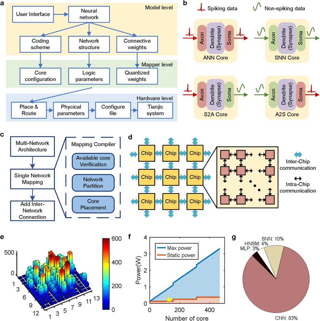 图5. 可扩展的计算平台。(a)Tianjic工具链的三级实现架构。(b)针对尖峰和非尖峰数据流的四种混合编码配置。(c)多网络制图策略流程图。(d)层次路由器结构示意图。(e)每个核心在路由器中分配通信流量。(f)不同芯数的功耗。(g)各网络的功耗分布。