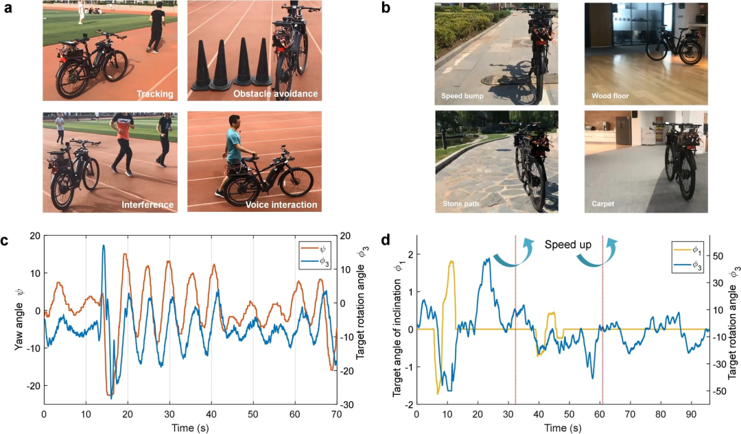 为应对许多不确定因素,机器人在现实世界中的操作具有挑战性。在这项工作中,本研究通过一系列现实世界的测试来评估该无人自行车平台,包括不同的道路条件、各种障碍物和环境噪音。图6a显示了一些真实场景的示例。无人驾驶自行车完成了一系列的行为,包括探测和跟踪一个人,识别语音命令,并采取相应的行动。在运动场、草地、石径、地毯等不同路况下,自行车能够轻松保持平衡并通过减速带(图6b),这得益于MLP的鲁棒性和系统的低延迟。这款自行车能够跟随随意奔跑的人,并自动避开障碍物。跟踪和避障性能如图6c所示。如果另一个人突然进入视野,自行车能够继续跟踪原来的目标。图6d显示了不同速度水平和多种运动模式的结果。根据指令生成目标倾角。自行车在不同速度下分别执行圆周线、S曲线和直线,仅通过一个网络完成不同速度级别之间的无级切换。这些测试证明了该机器人平台在动态可变环境中处理多种任务的有效性。