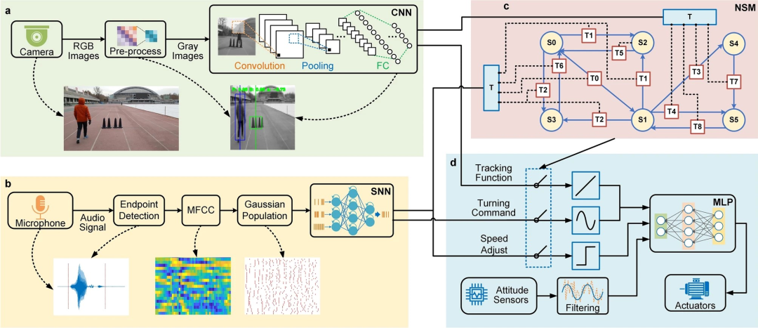 每个模块开辟了独立的数据路径,这些路径在信息表示、频率和吞吐量上都是不同的。在视觉模块中,将视频以多位值的形式馈入CNN,从而在有限的计算资源下保持丰富的环境空间信息(图3a)。原始音频流在听觉模块中被转换成二进制尖峰串。通过Mel频率倒谱系数(MFCC)得到关键频率特征。使用高斯总体将每个MFCC特征编码为尖峰序列,作为三层全连接SNN的输入(图3b)。图3c展示了基于HNSM的决策模块的结构和数据流。对于运动控制,首先由功能核心产生序列信号,与其他模块的转向指令合并,作为综合目标角度。然后通过MLP网络整合来自所有传感器的数据以进行角度控制(图3d)。