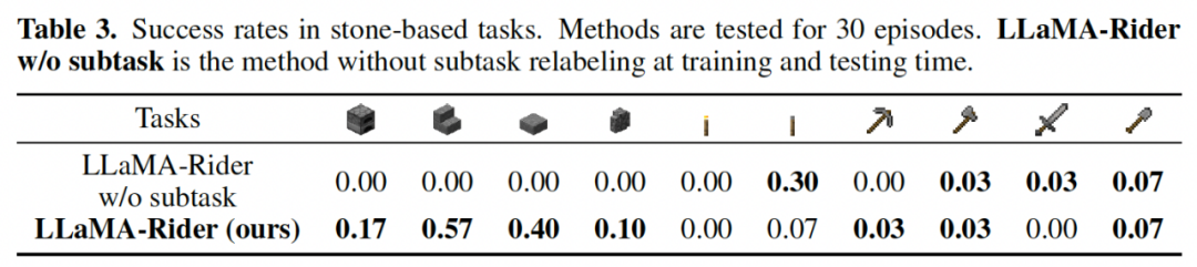 在消融实验中,作者利用包含更多子任务的石头相关任务,验证了子任务重标记的方法对于任务成功率和任务泛化能力的关键作用。