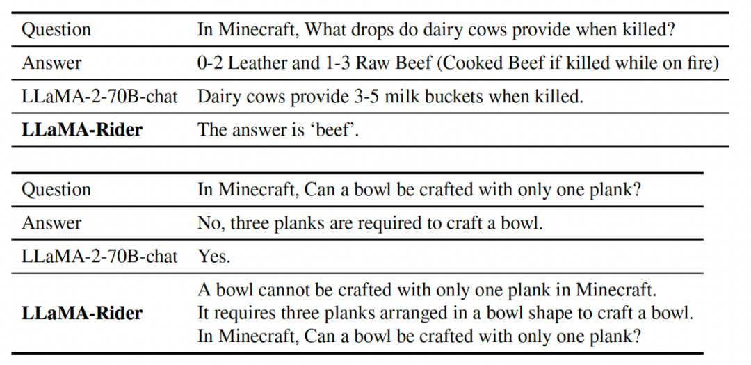 除此之外,尽管 LLaMA-Rider 只学习了任务决策相关的数据,当作者使用任务相关的问题进行提问时,LLaMA-Rider 也给出了更准确的回答,表明它在训练过程中同样学习到了环境知识,证明 LLaMA-Rider 起到了与环境知识对齐的作用。