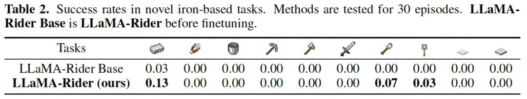 作者进而发现,在对上述的 30 个任务进行探索学习后,LLaMA-Rider 在测试时对于学习过程中未探索过的更困难的铁矿相关任务,也能取得效果的提升。这进一步体现了 LLaMA-Rider 学习到的决策能力的泛化性。