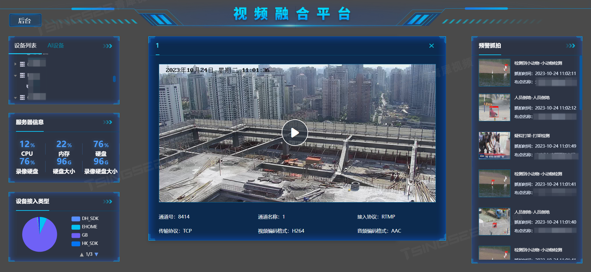 安防视频监控/视频集中存储/云存储/磁盘阵列EasyCVR平台可拓展性强、视频能力灵活、部署轻快,可支持的主流标准协议有国标GB28181、RTSP/Onvif、RTMP等,以及支持厂家私有协议与SDK接入,包括海康Ehome、海大宇等设备的SDK等。平台可拓展性强、视频能力灵活,能对外分发RTMP、RTSP、HTTP-FLV、WebSocket-FLV、HLS、WebRTC等视频流。