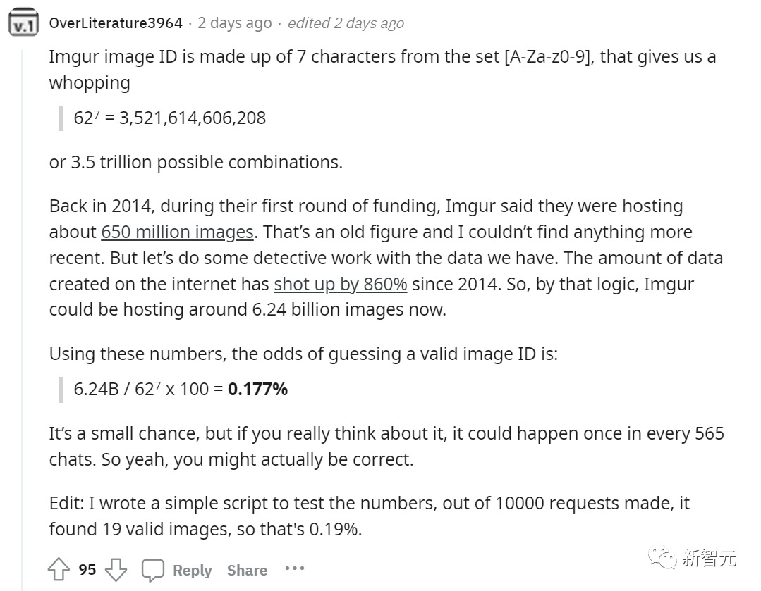 有人算出来,Imgur图像ID是由集合 [A-Za-z0-9] 中的7个字符组成,所以有 62^7=3,521,614,606,208,也就是3.5万亿种可能的组合。