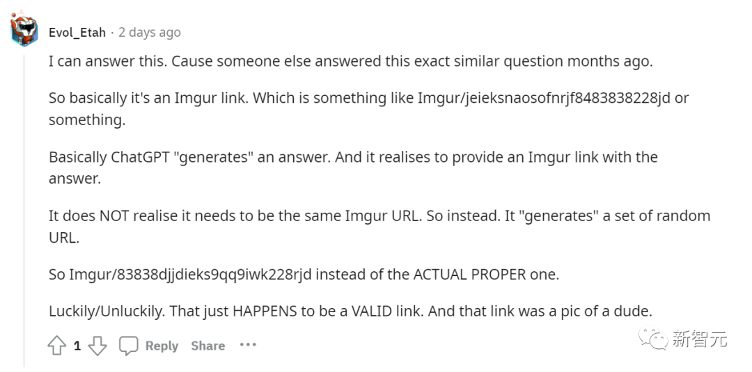 另外一个网友也给出了类似解释:ChatGPT生了一个答案,是一个Imgur链接。