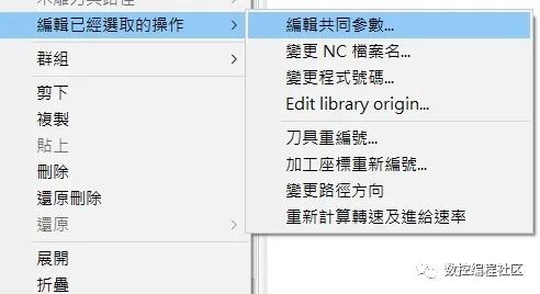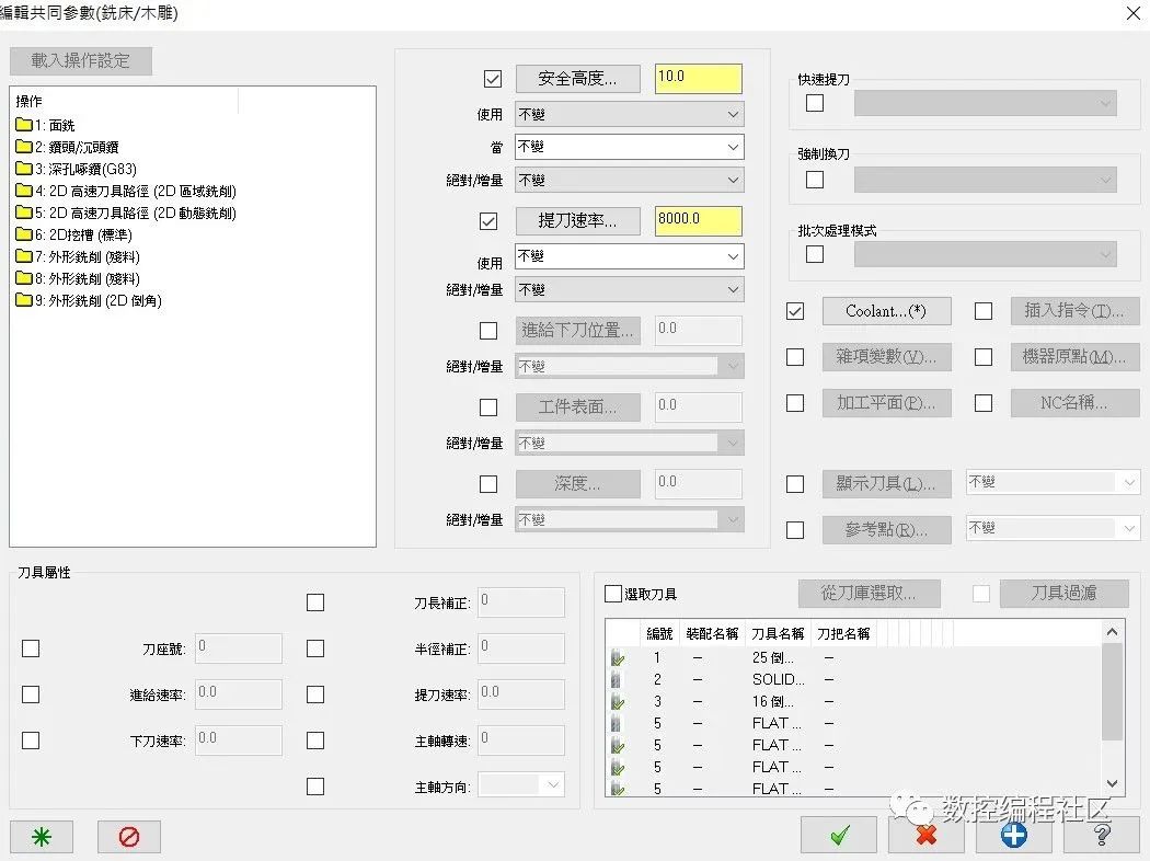步骤3:开启编辑共同参数,您可以一次性设定,所选取刀具路径的安全高度、提刀速率与冷却液(Coolant)等功能来同时做参数变更。