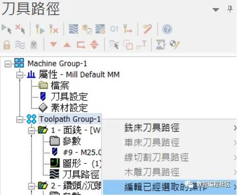步骤1:将鼠标拖移到刀具群组名称(Toolpath Group),并点击鼠标右键,选择
