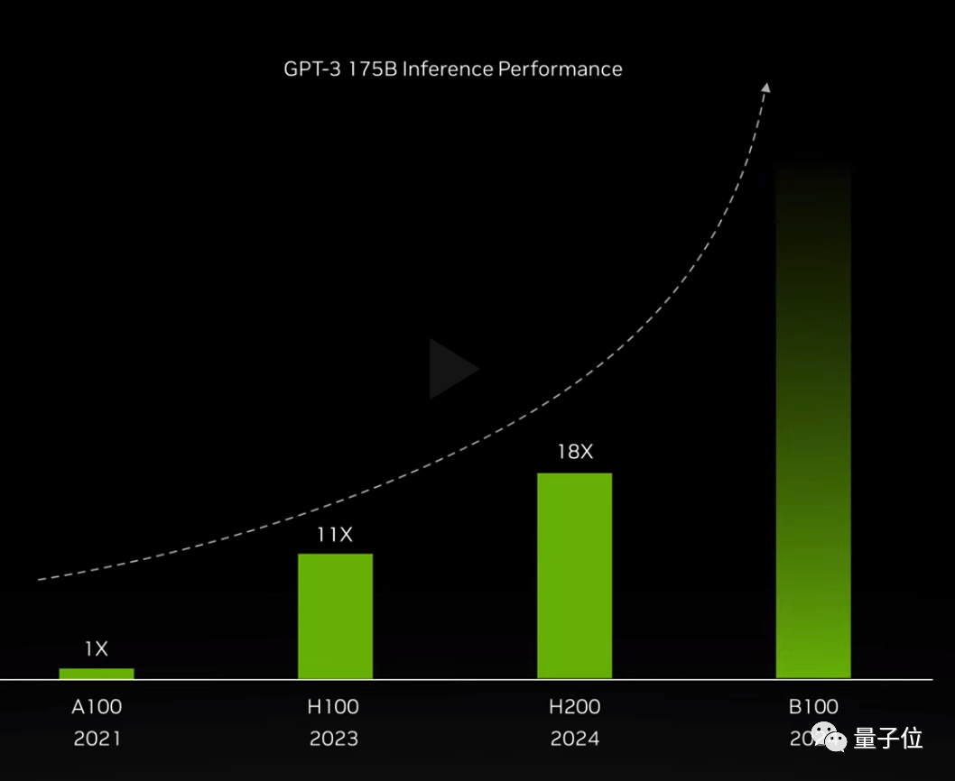 同样在2024年的第4季度,基于下一代Blackwell架构的B100也将问世,具体性能还未知,图表暗示了会是指数级增长。