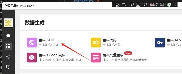 点击左侧边栏第2个小图菜单,点击【生成 GUID】: