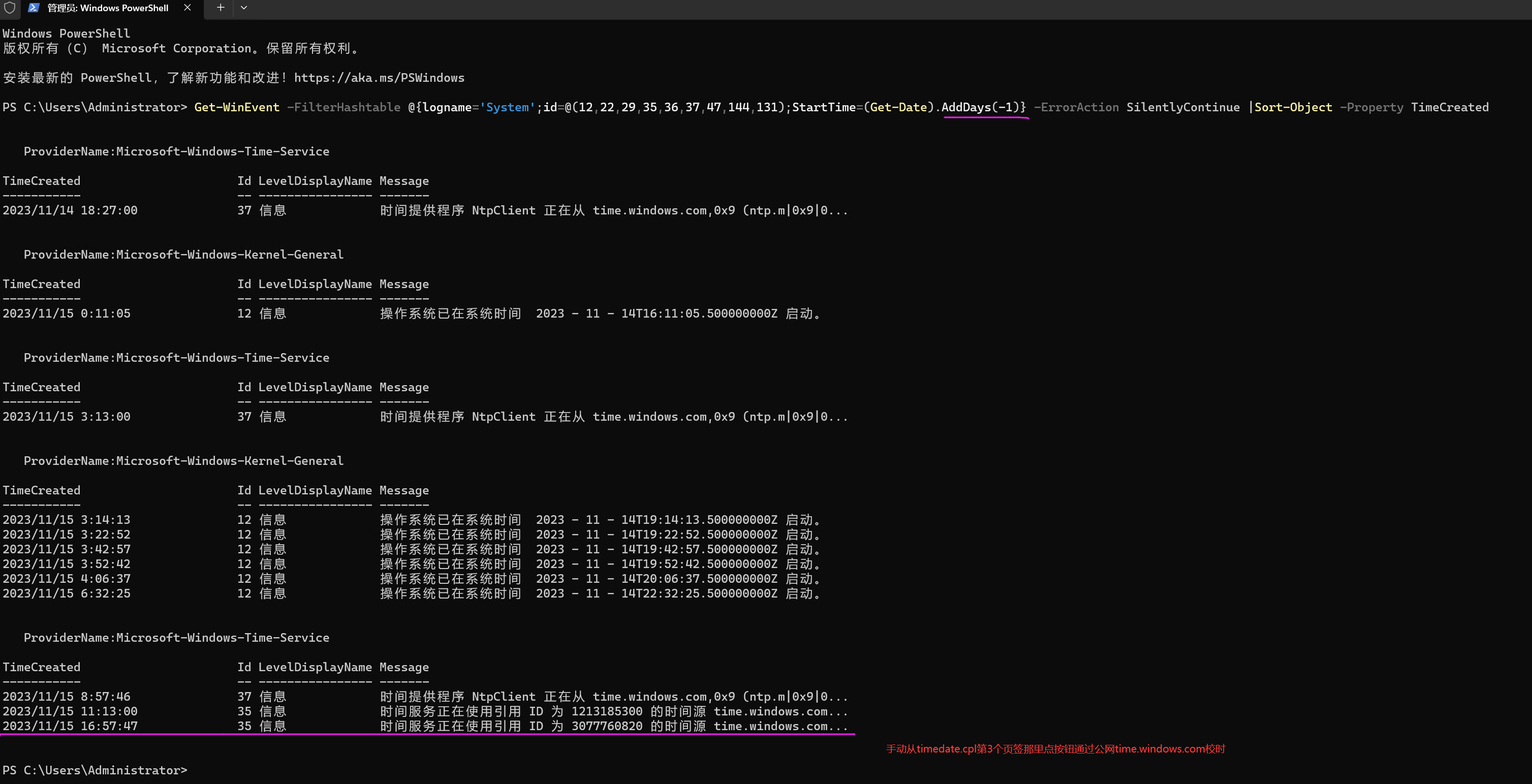 我用PC系统的ISO安装的系统,发现比北京时间少8小时,排查发现Windows Time服务默认是手动的,手动校时后正常,然后设置了Windows Time服务开机自动启动。这个过程中就有上述日志产生。