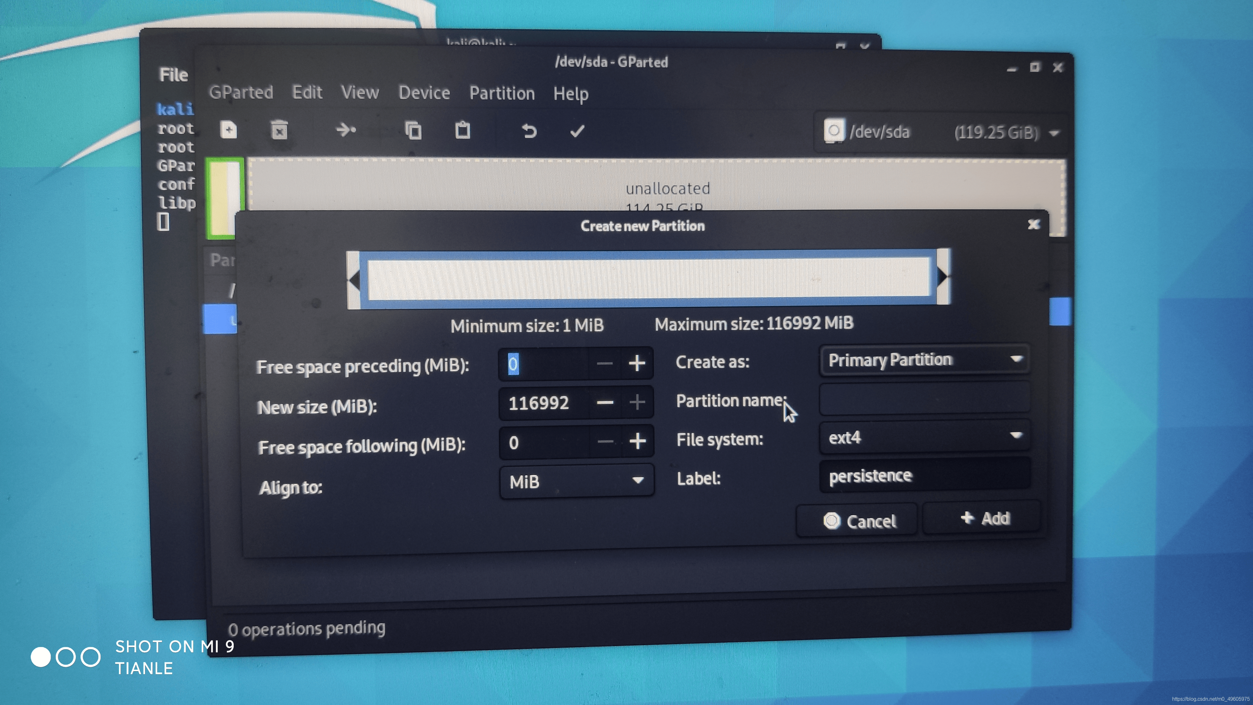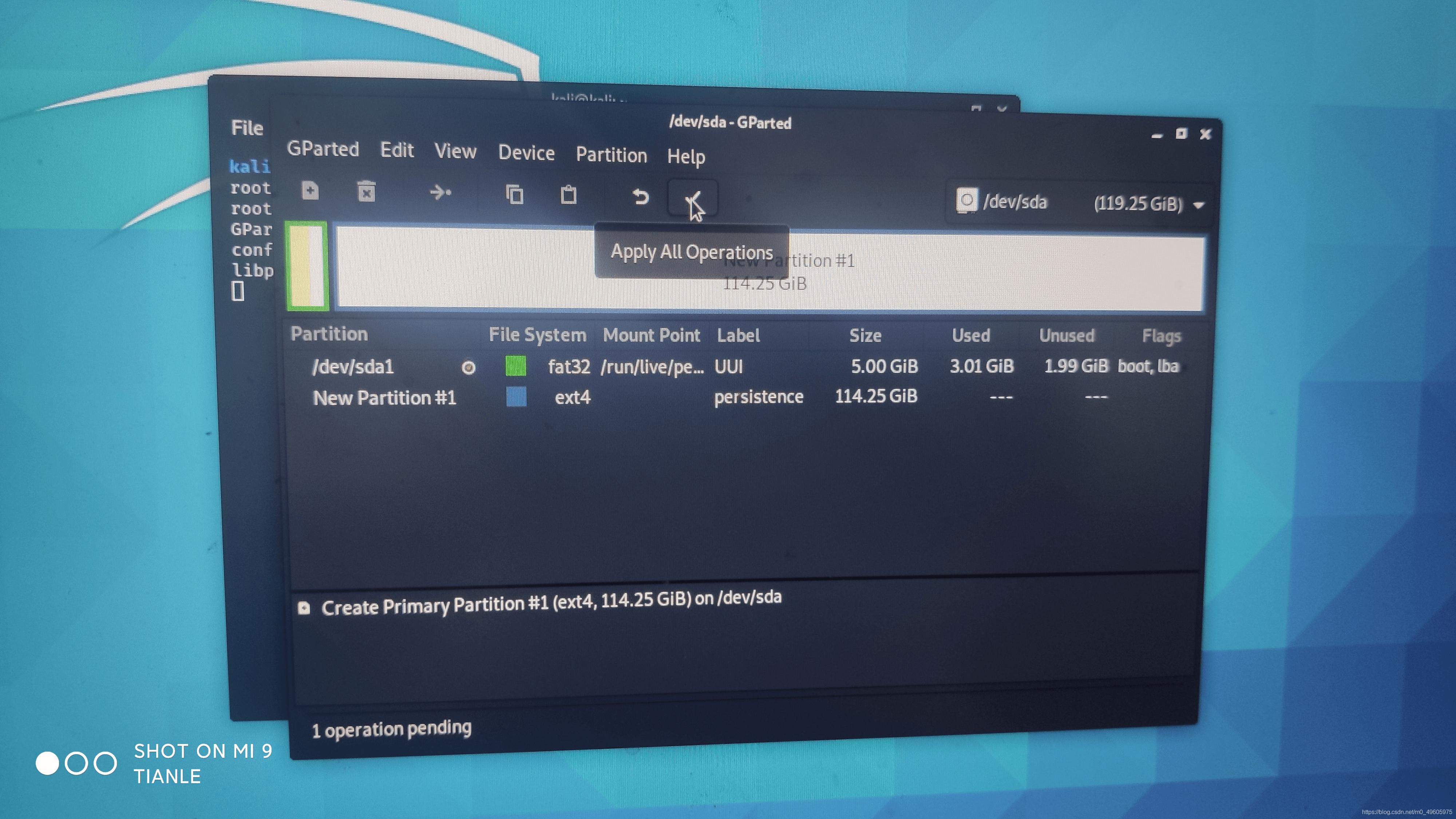 5.命令行进入使用root权限(sudo su命令切换到root用户),输入“gparted”命令调出kali自带的分区工具,将剩余的分区设置为ext4格式,命名为persistence,最后点击保存(当然你也可以将多余的空间再分出一部分用于日常储存文件或者在一开始你就利用DiskGenius,MiniTool Partition Wizard等分区工具分好区),如果你是小白请按照我的教程一步一步来。