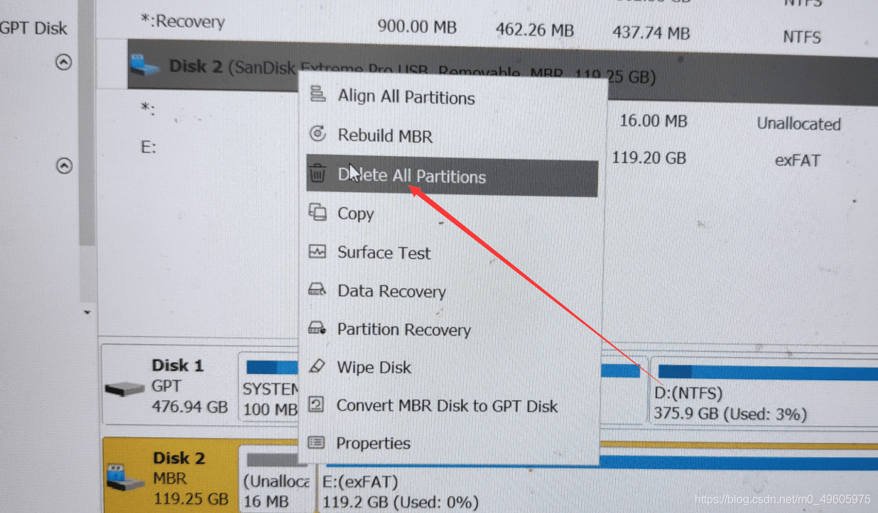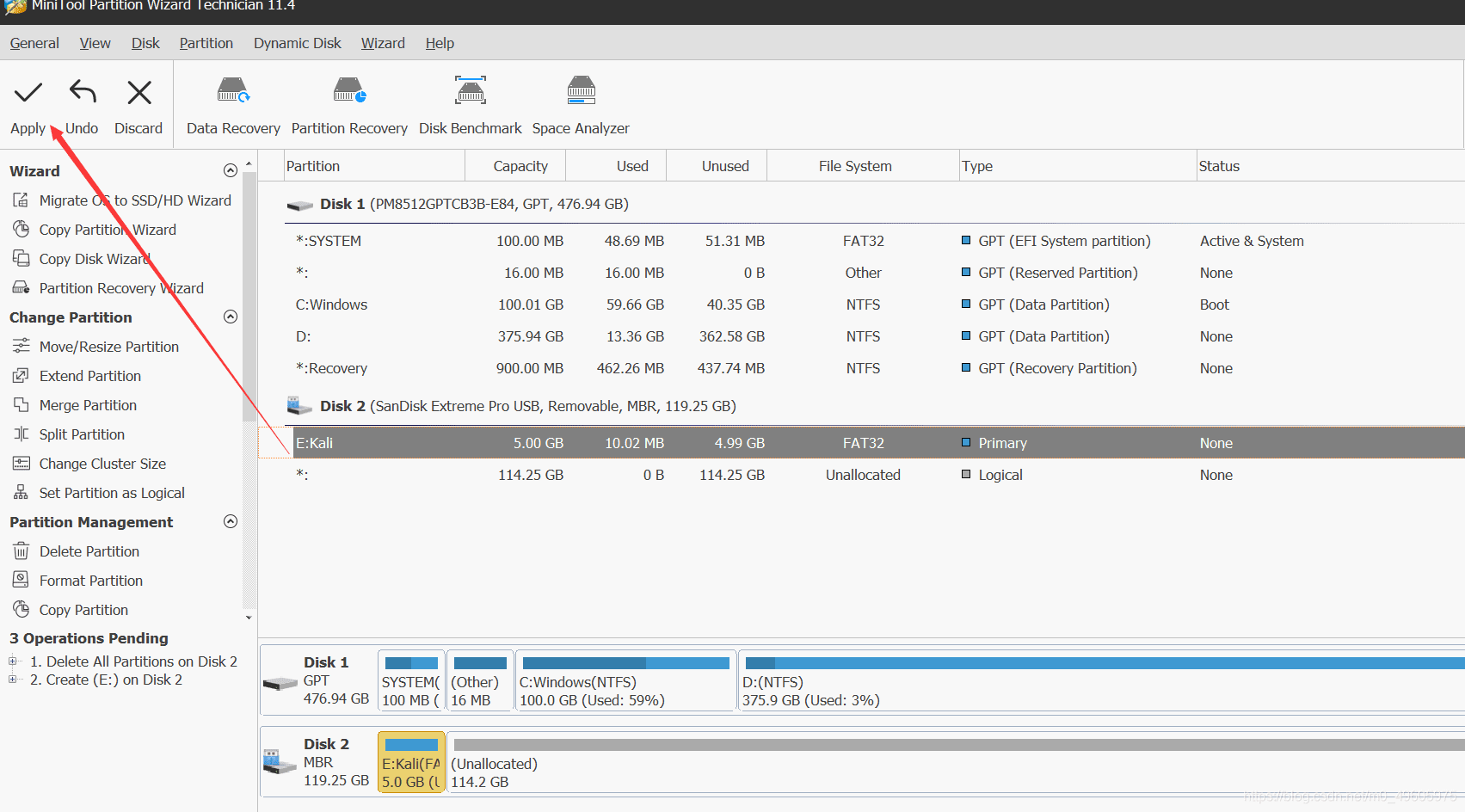 2.我们利用MiniTool Partition Wizard (分区工具),将u盘数据全部删除,然后再分为两个区,主系统区要FAT32格式且至少4g空间,最后一定要确认,如图。
