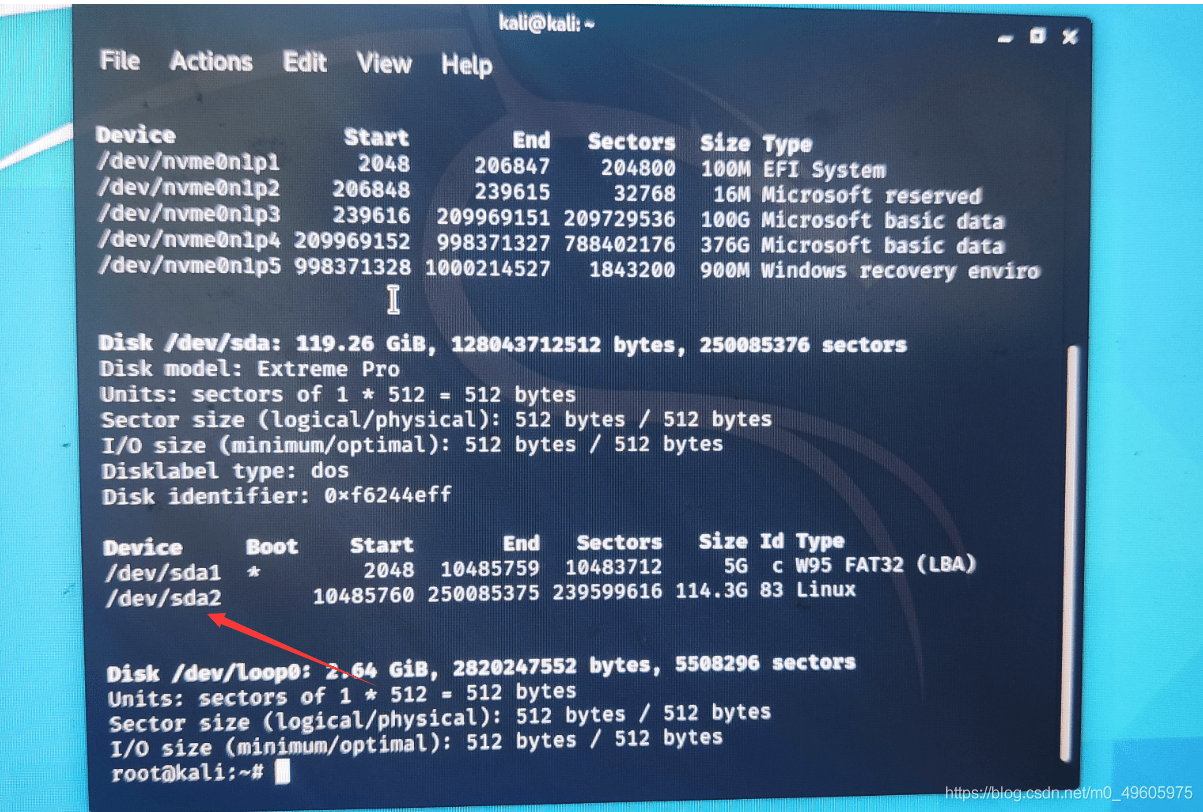 6.接下来继续打开终端输入命令”fdisk -l”,查ext4格式刚才分好区的设备名称,比如我的就是 /dev/sda2 每个人都可能不一样,记住自己的就行。