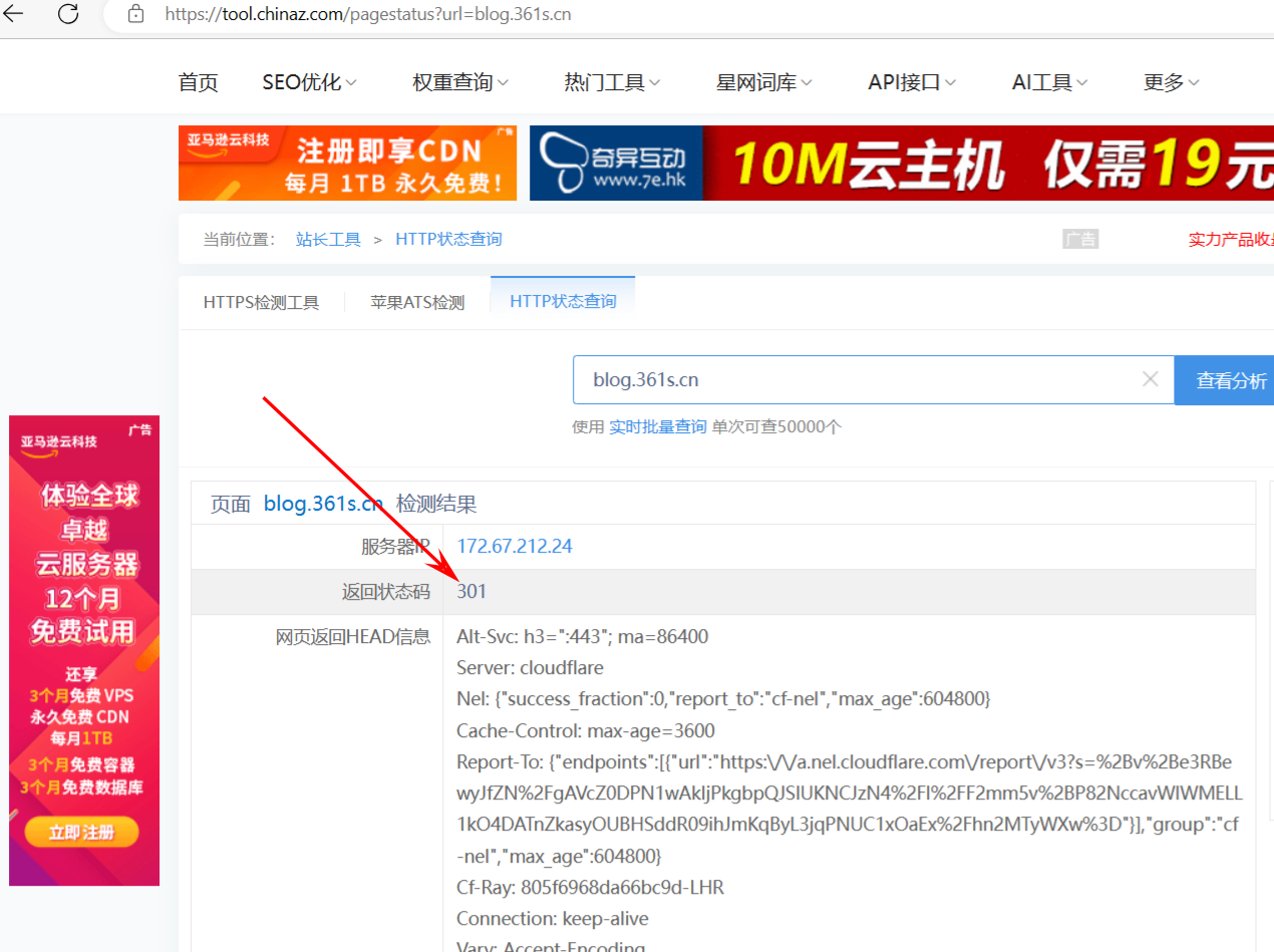 2.可以使用在线工具,输入网址即可查询HTTP状态,例如站长之家:https://tool.chinaz.com/pagestatus?url=blog.361s.cn