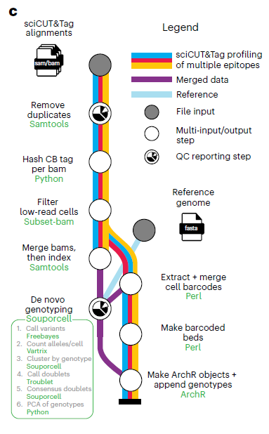 基因型分配注释的 ArchR对象以及细胞元数据表。管道中使用的软件以绿色显示,管道终点为黑线。
