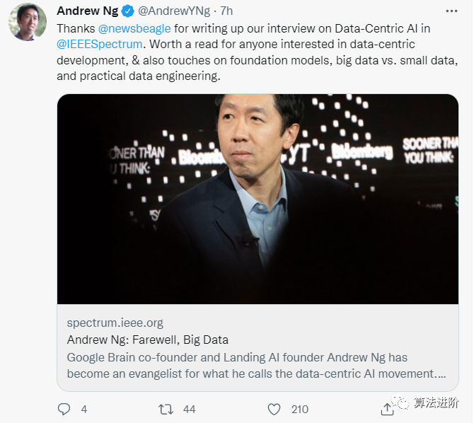 吴恩达:过去十年,人工智能最大的转变是深度学习,而接下来的十年,我认为会转向以数据为中心Data-centric Artificial Intelligence(DCAI)。随着神经网络架构的成熟,对于许多实际应用来说,瓶颈将会存在于如何获取、开发所需要的数据...只要拥有50个好数据(examples),就足以向神经网络解释你想让它学习什么。
