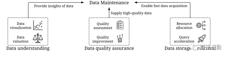在现实应用中,数据并非一次生成,而是不断更新的,需要进行连续的维护。数据维护的目的是在动态环境中确保数据的质量和可靠性。它涉及三个基本子目标:1)数据理解,旨在提供复杂数据的可视化和评估,使人类能够获得有价值的见解;2)数据质量保证,旨在制定定量测量和质量改进策略来监控和修复数据;3)数据存储和检索,旨在设计高效的算法,通过合理分配资源和高效率处理查询来提供所需的数据。数据维护在以数据为中心的人工智能框架中起着基础和支持作用,确保训练和推断中的数据准确可靠。本节概述了对数据维护的需求、代表性方法(如图6所示)和挑战。如图6所示。表4总结了相关任务和方法。