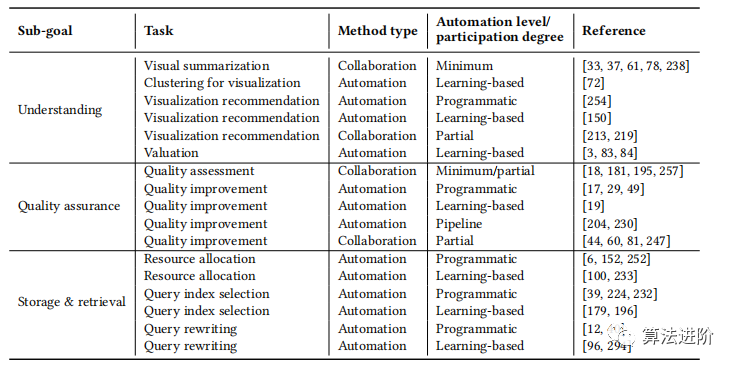 以数据为中心的人工智能涉及数据生命周期各阶段的任务,根据是否需要人类参与分为自动化和协作两大类。每种方法都有不同的自动化程度或需要不同程度的人类参与,如图7所示。自动化任务涉及编程自动化、基于学习的自动化和流水线自动化,以提高效率和准确性。协作任务需要不同程度的人工参与,包括完全参与、部分参与和最低参与。这种分类有助于理解不同方法如何应用于不同的以数据为中心的目标,并实现效率和效果的权衡。