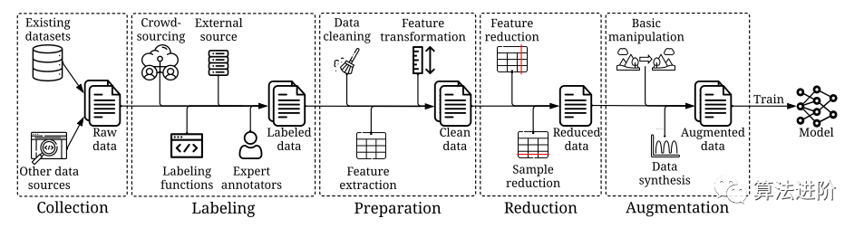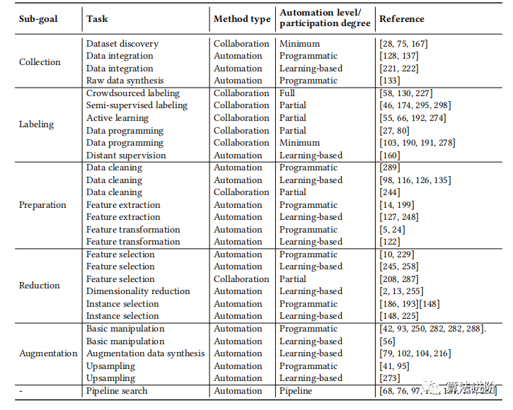 训练数据为机器学习模型提供了基础,因为模型性能在很大程度上受其质量和数量的影响。训练数据开发的目的是收集和生成丰富、高质量的训练数据来支持机器学习模型的训练,包括五个子目标,分别为:1)数据收集,2)数据标注,3)数据准备,4)数据缩减,5)数据增强。最后我们将讨论管道搜索,这是一种新兴趋势,旨在连接这些步骤并搜索最有效的端到端解决方案。