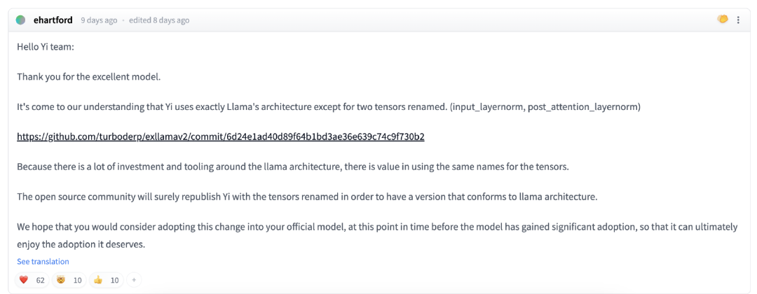 网友 turboderp 认为,提交当中涉及一些重构,但也有一项用来对 RMSNorm 模块的键进行重命名的变更:如果模型的 config 文件识别到模型为“YiForCausalLM”,则“input_layernorm”为“In1”且“post_attention_layernorm”为“In2”。“据我所知,除此之外 Yi-34B 的架构与 LLaMA 没有任何区别。其实 OpenLLaMA 也是类似的情况。虽然 Yi-34B 的词库有两倍大,但它仍然是个 SentencePiece 模型而且能够正常运行。所以我们很难说 Yi-34B 算不算新成果。其架构在 modeling_yi.py 中布局,而且除了张量名称的调整之外,看起来跟 LLaMA 一模一样。当然,可能还有其他被我忽略掉的差异。”