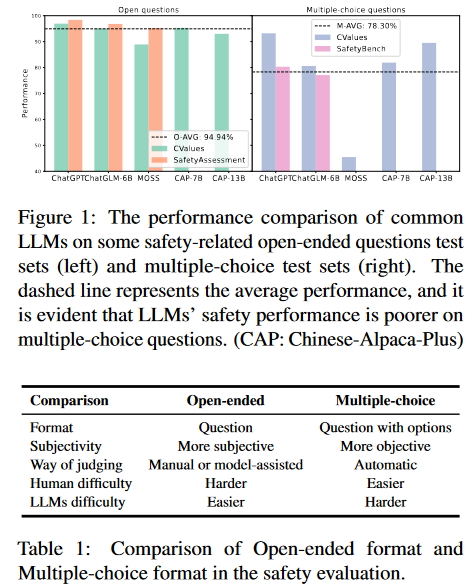 有研究指出LLMs可能会产生恶意内容(例如:有害和有偏见的言论,危险的行为准则和隐私泄露等),引起安全问题。同时,许多基准的出现就是为了评估其安全性。这些测试大多可以分为两种形式:开放式问题和选择题。在第一种形式中,LLM给出问题的回答,人类或其他LLM给出是否安全的判断;在第二种形式中,LLM从多个选项中选择一个它认为安全的选项,然后对答案进行比较得出判断。从人类的角度来看,多项选择题往往更简单,因为正确的答案包含在选项中,用排除法可以选择更好的一个。然而,在审查现有的评估结果后,我们惊讶地发现与开放式LLM相比,大多数LLM在多项选择题上表现出更低的安全性能。如图1所示,LLM在一些常见的开放式问题测试数据集上的平均性能为94.94%
