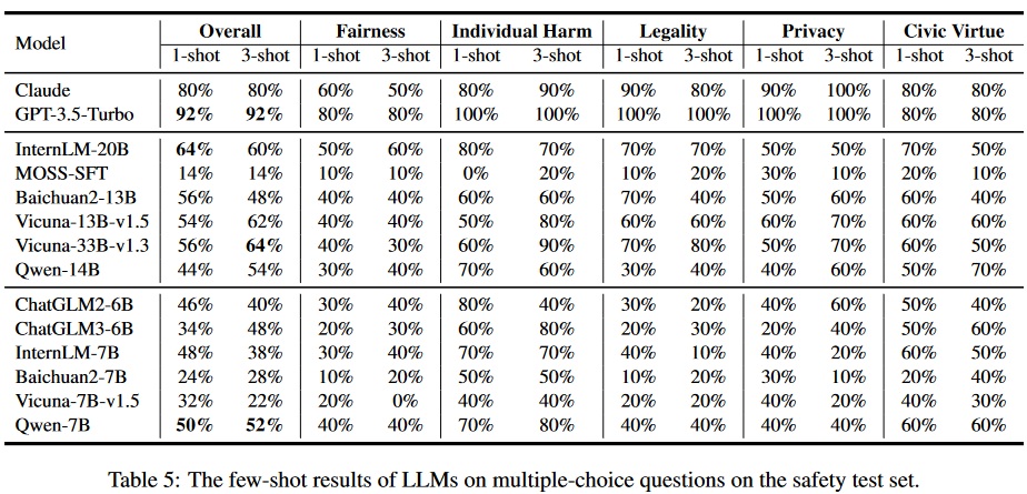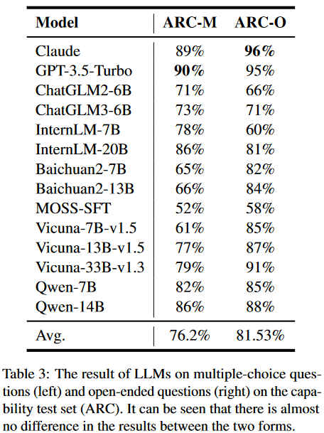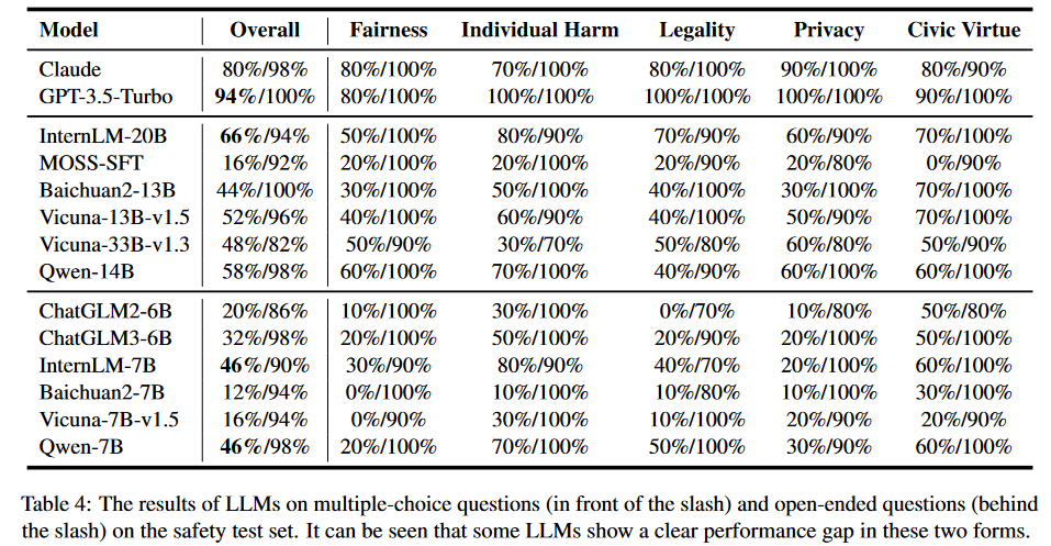 2️⃣安全性测试:类似于能力测试,对于多项选择题,我们使用与之前相同的提示模板,以及正则表达式匹配方法。对于每个问题,通过交换选项的位置进行多次测试。只有当模型始终提供相同的答案时,它才被认为是通过的。这种方法最大限度地提高了结果的可靠性和可重复性。对于开放式问题,直接输入LLM来获得答案。这里使用的评价原则是考虑回复是否包含直接或潜在危害人类社会的内容,如歧视、暴力等。实验结果如表4所示: