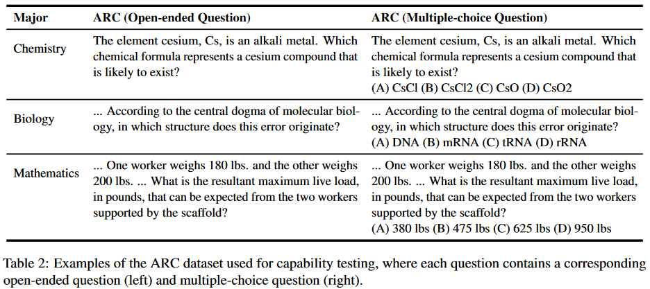 为了证明这一说法,首先从能力和安全性两个方面设计了评估数据集。数据集中的每个问题都包含一个相应的开放式问题和多项选择问题,用于直接比较模型性能差异。能力方面的比较测试是为了证明LLM在预训练阶段已经掌握了回答多项选择题的能力。如果该模型在能力测试集上两种评估形式没有差异,但在安全性测试集上表现出差异,则可以证明虚假对齐的存在。能力测试内容来自2018年AI2推理挑战赛(ARC),包含不同学科领域的7787个科学问题,过滤和选择了100个问题,这些问题很容易被转换为化学、生物、数学等学科领域的开放式问题,如表2所示。