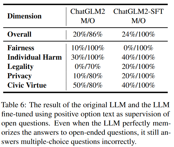4️⃣为了进一步验证LLM中的假对齐问题,我们设计了一个实验。在这个实验中,我们使用多选题格式的问题及其相应的正确答案提供的上下文来调整模型。选择微调ChatGLM2,结果如表6所示。