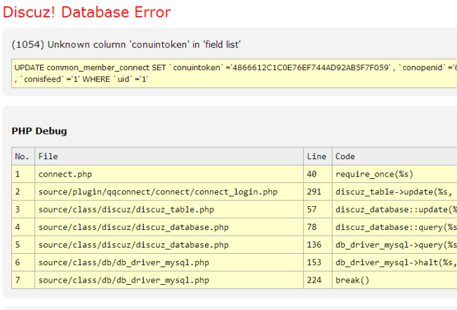 qq登入时报Unknown column 'conuintoken' in 'field list'这个错误,具体信息如下