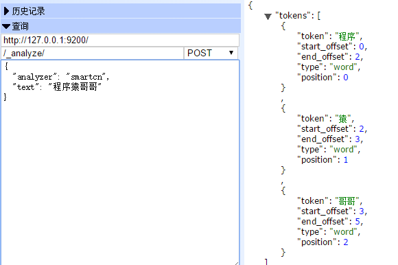 安装分词:plugin install analysis-smartcn ,安装完成后,重启我们的es服务,可以直接测试分词的效果,下面是我的测试结果: