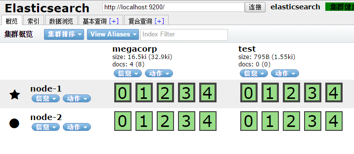 其他的不变,一定要保证集群的应用名称是一致的,然后进入到ES的副本的bin目录下启动服务,成功后用head插件查看,可以看到两个node节点,如下: