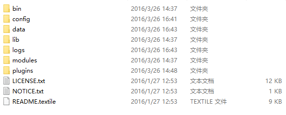首先去官网下载最新的ES,地址:点我下载 , 这个链接提供的是windows版本的,下载下来的是一个zip压缩文件,解压缩后的文件结构如下:
