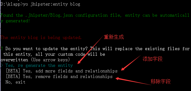 ps:实体生成后,就博主目前了解,没有相关delete的 指令,只可以添加/更新字段和更新实体关联关系,使用 yo jhipster:entity blog,如果blog存在,会有如下提示以及可选的操作