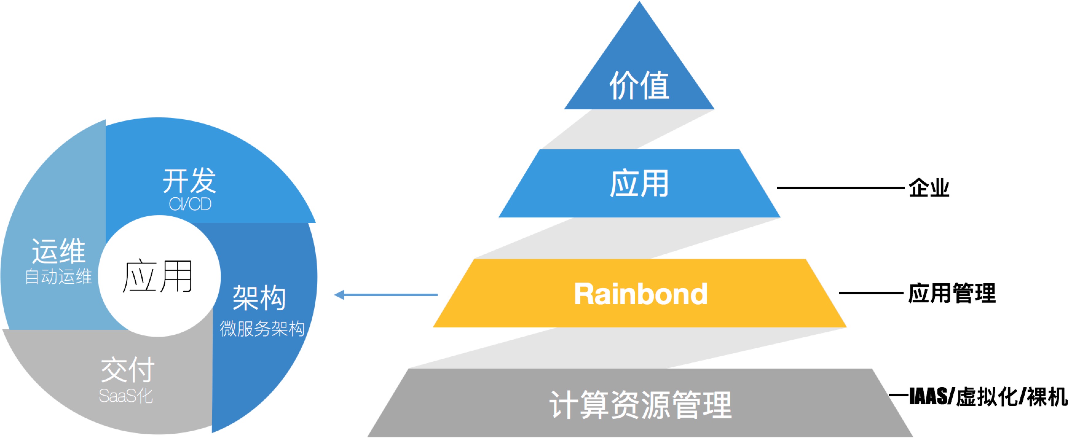 我们在应用与计算资源管理这两者之间增加一层应用管理(无服务器PaaS和云原生SaaS),完全以应用为中心进行设计,将应用与计算资源解耦,应用管理之上,开发或使用人员只需要关注业务设计,编码,测试,上线流程环,应用管理平台自动化完成从源码到云端运行的复杂流程。