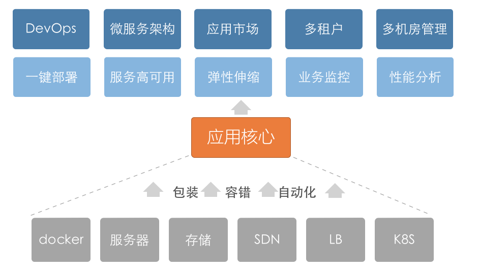 对于大多数IT企业和互联网企业,企业价值的直接体现在于创造的应用或运营的应用本身,也就是说在业务本身上。然而我们都知道,一个业务系统需要运行,必须得搭建运行环境,考虑网络、存储、配置、负载均衡、安全等等一系列复杂的计算资源管理问题,而且每一次系统搭建都重复得进行,往往在这些问题上花费大量的成本。