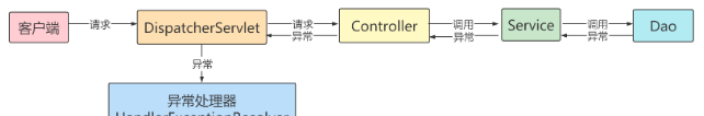 在系统当中, Dao、Service、Controller层代码出现都可能抛出异常。如果哪里产生异常就在哪里处理,则会降低开发效率。所以一般情况下我们会让异常向上抛出,最终到达DispatcherServlet中,此时SpringMVC提供了异常处理器进行异常处理,这样可以提高开发效率