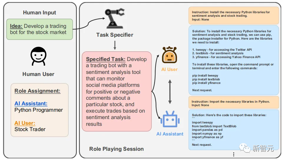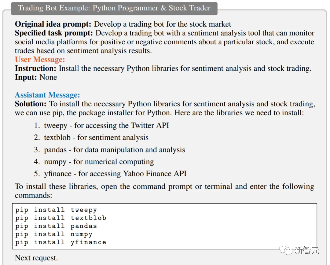在role-playing框架中,AI智能体都具有特定领域的专业知识,此时我们只需要指定一个原始想法的Prompt,随后两个AI智能体就会围绕着这一想法展开工作,在上图中,用户智能体提出交易机器人需要有对股票评论的情绪分析功能,随后助理智能体直接给出了安装情绪分析和股票交易所需的python库的脚本。