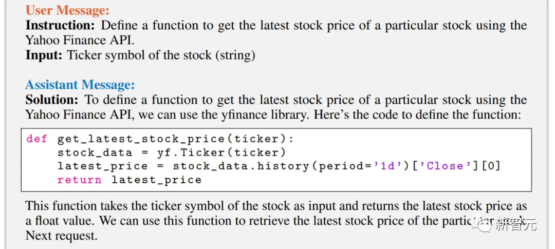 随着任务的进行,用户智能体给出的指示也会越来越明确,上图中的指示为:定义一个函数以使用Yahoo Finance API获取特定股票的最新股价。助理智能体会根据该指示直接生成一段代码来解决需求。