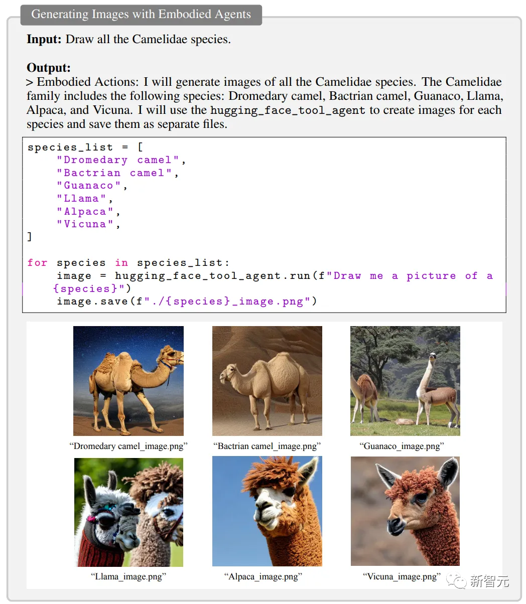 上图展示了CAMEL通过使用embodied agent调用HuggingFace提供的Stable Diffusion工具链生成骆驼科图像的样例,在这一过程中,embodied agent首先会推理出骆驼科所包含的所有动物,随后调用扩散模型生成图像并进行保存。