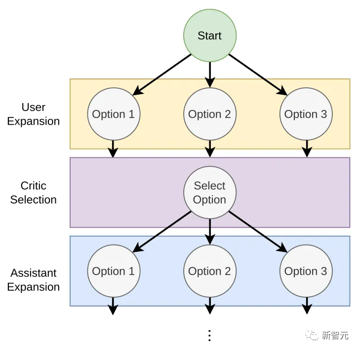 为了增强role-playing框架的可控性,作者团队还为CAMEL设计了一种critic-in-the-loop,这种机制受到了蒙特卡洛树搜索(MTCS)方法的启发,它可以结合人类偏好实现树搜索的决策逻辑来解决任务,CAMEL可以设置一个中间评价智能体(critic)来根据用户智能体和助理智能体出的各种观点进行决策来完成最终任务,整体流程如下图所示。