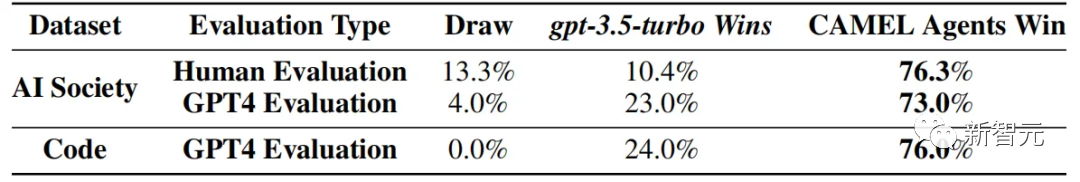 在这一部分,作者从AI Society和AI Code数据集中分别随机选择 100 个任务进行评估,然后使用CAMEL框架和单个gpt-3.5-turbo进行对比实验。