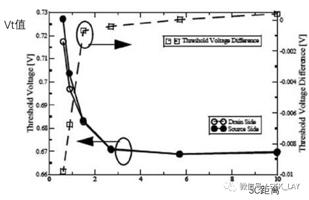 可以看出SC距离越远时,Vt值的变化越小,到了一定值时(不同工艺有不同距离要求),Vt值基本保持不变。