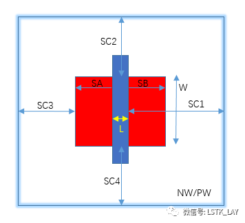 4.2 对于一些关键匹配的器件(如差分对、电流镜等),远离阱放置,特别注意在远离的同时,需要注意匹配器件SC值的控制,如下图;如让Vt变化更小,建议SC1、SC2、SC3、SC4大于2um(TSMC 40nm工艺要求)。不同工艺要求不同,具体请参考对应工艺规格书。