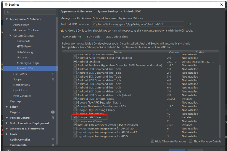在Settings打开Android SDK,右侧选择SDK Tools下载Google USB Driver,安装成功之后点击右下角的apply.