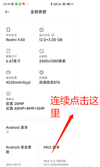手机点击设置,进入开发者模式(这里一般是点击自己的连续点击自己的版本号,即可打开开发者模式)这里以我的Readmi K40为例:
