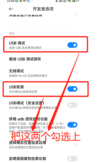 点击更多设置, 选择开发者选项,把USB调试和USB安装都勾选上。