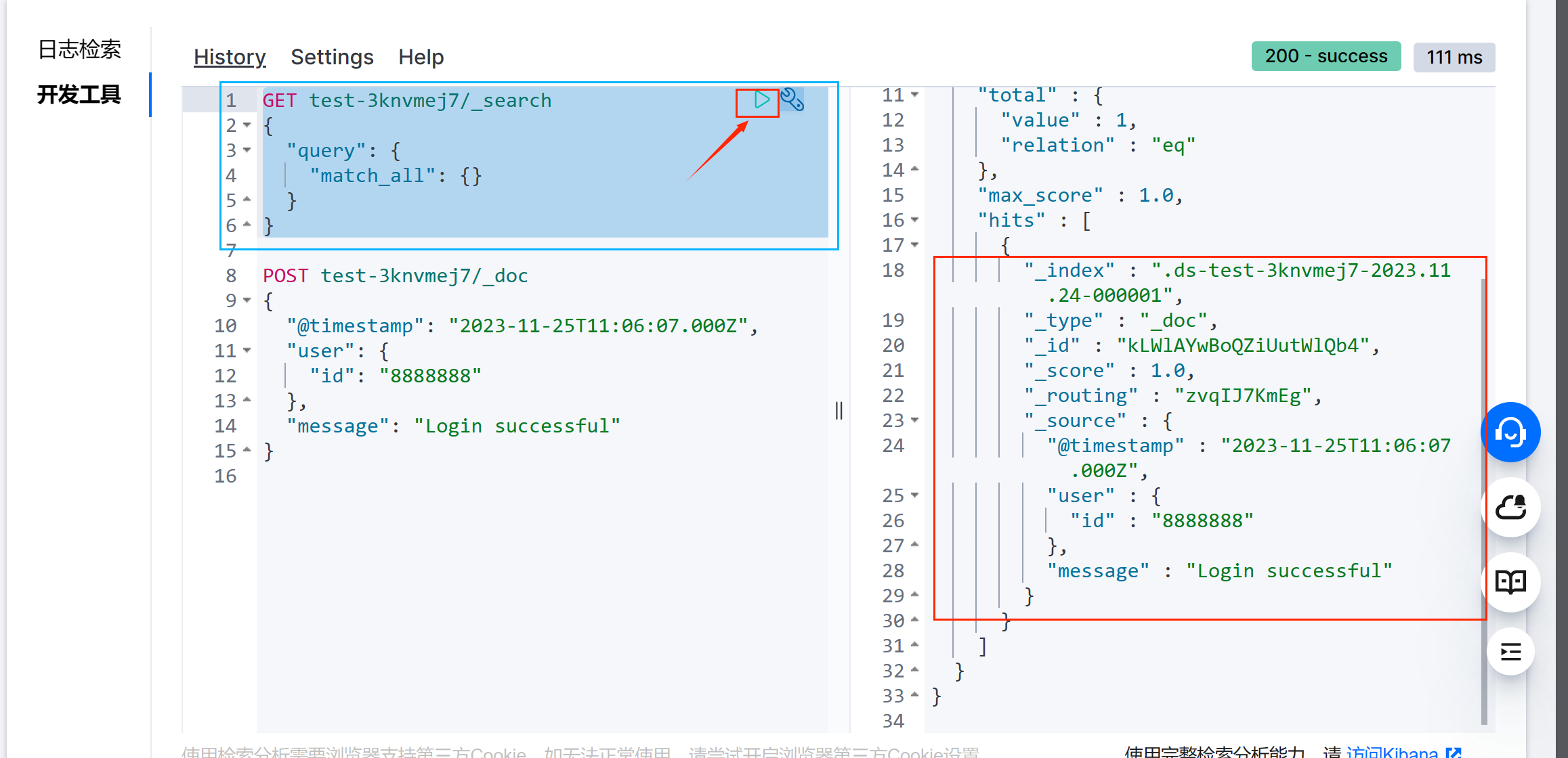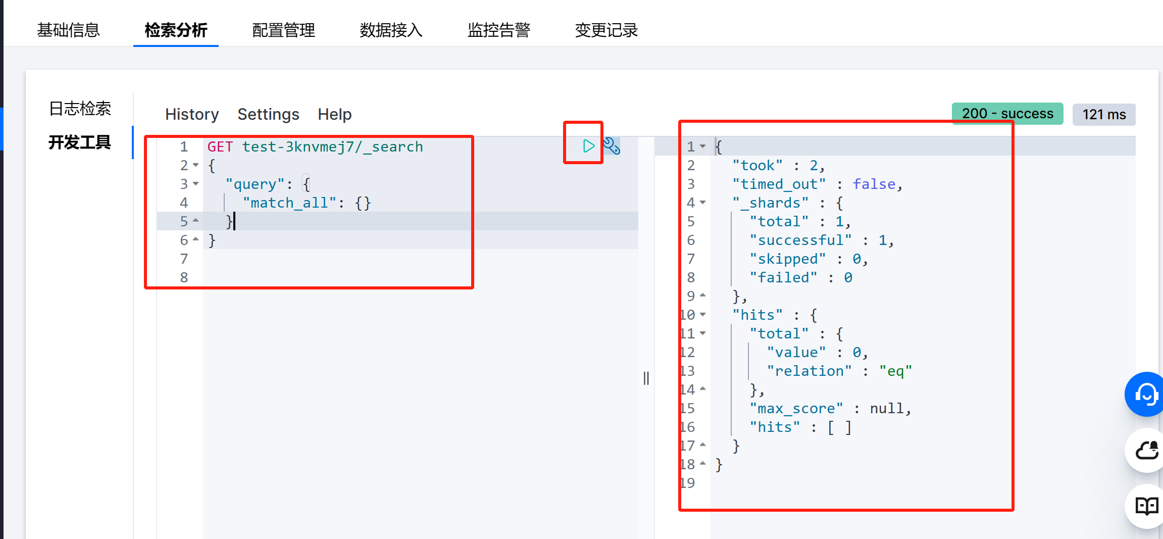 点击检索分析,进入界面,我们可以看到一个类似Kibana 的界面(Kibana 的相关模块已经内嵌到腾讯云控制台)我们可直接在控制台使用检索分析能力。
